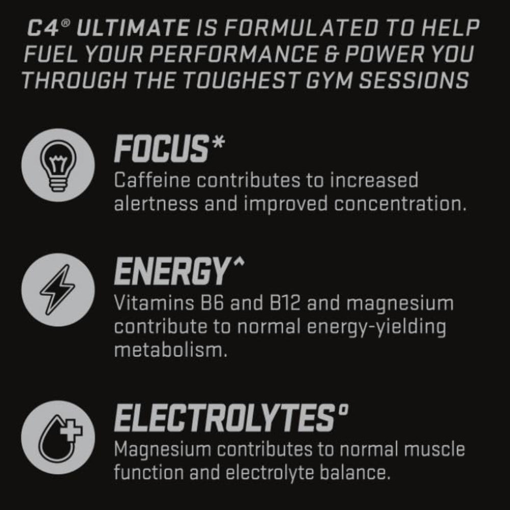 🚀 Feel the Surge in One Scoop Whether you're chasing PBs or crushing cardio, C4 Ultimate delivers energy you can feel, focus you can harness, and results you can see.* Packaging May Vary